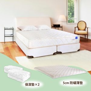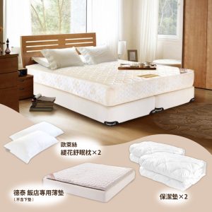 產品內容包含 : 彈簧床墊*1、飯店專用薄墊*1、緹花枕(單人搭配1顆/雙人搭配2顆)、保潔墊*2